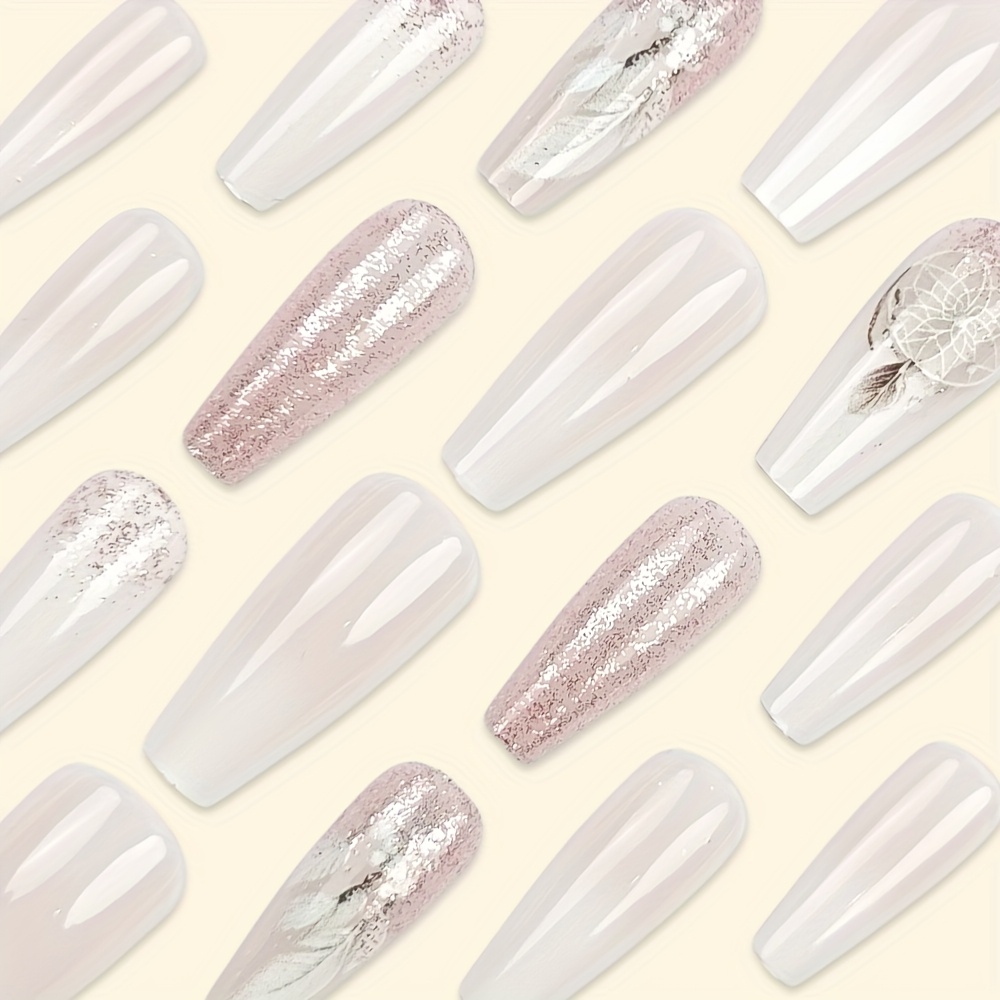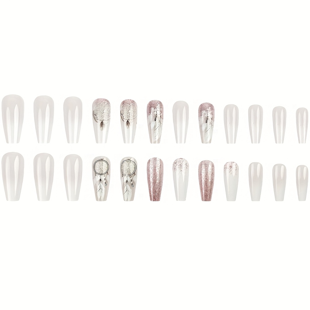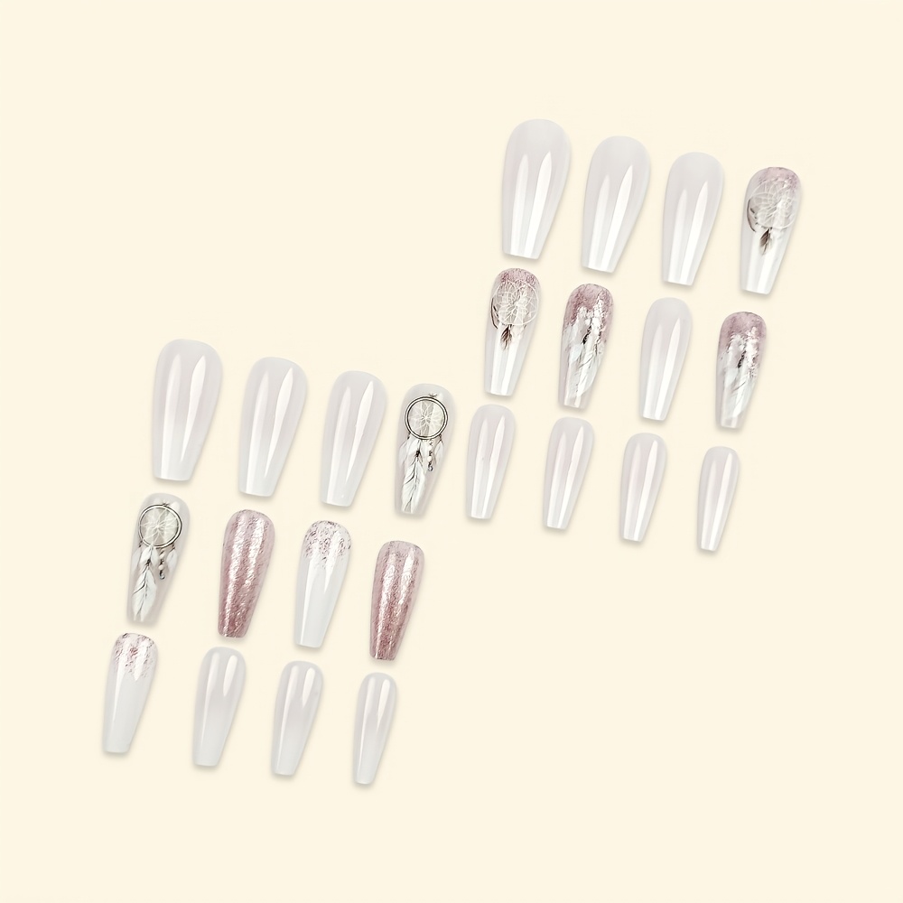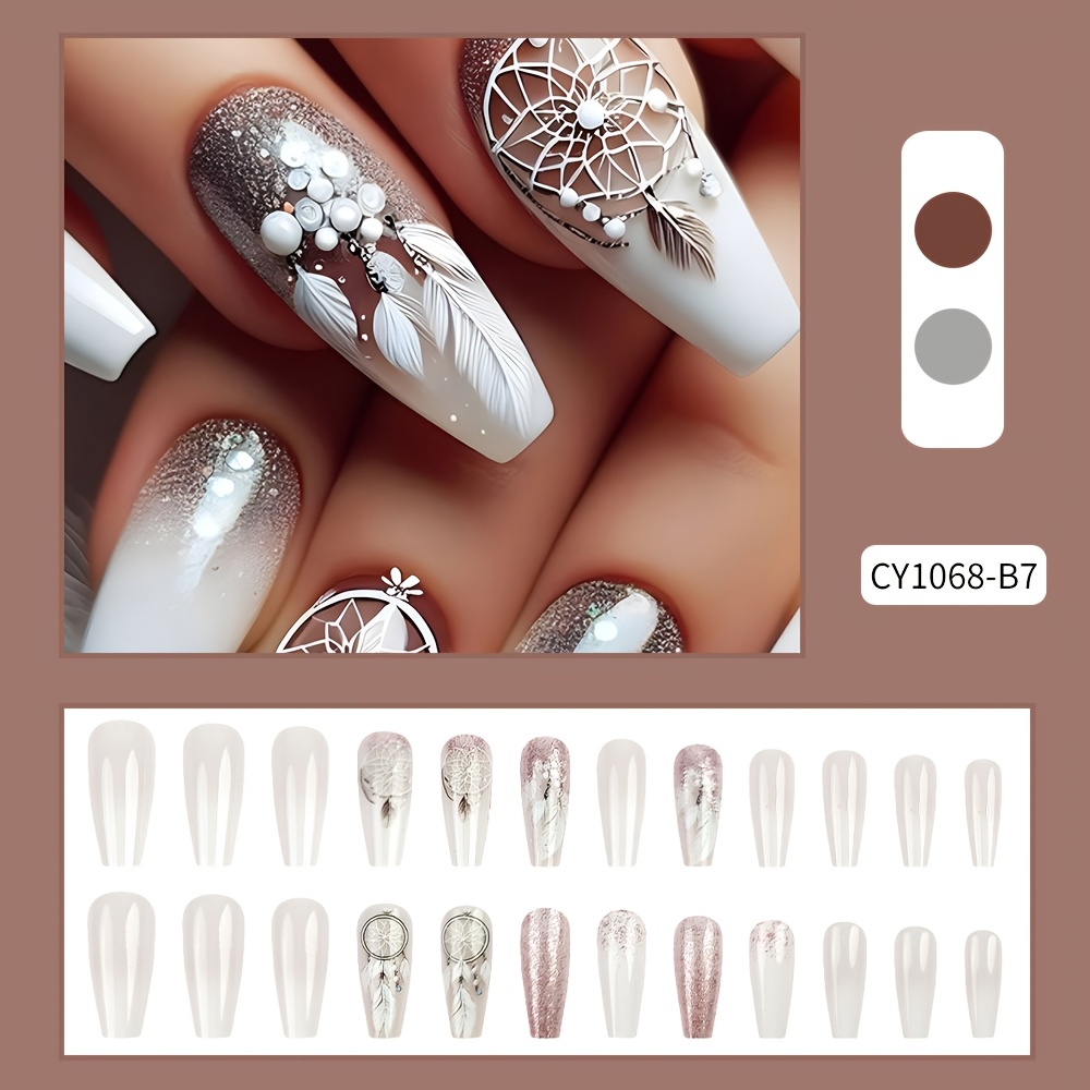 24pcs Set of Coffee glitter gradient dream catcher white feather with Glossy Finish, Removable Pattern Fake Nails for Women & Girls - Ideal for Spring & Summer, Nails for Girls
